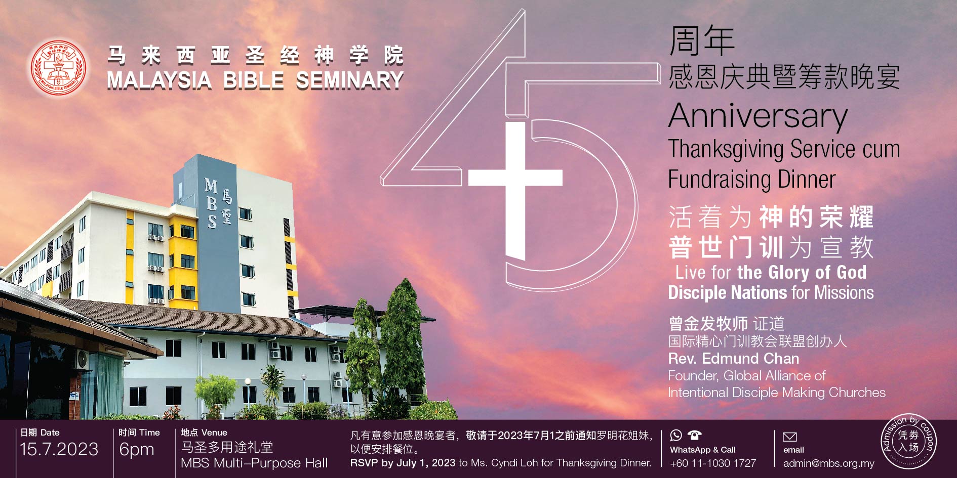 Thank God for His guidance and provision, this year will be marked MBS's 45th anniversary. We will be organizing a 45th Anniversary Thanksgiving Service cum Fundraising Dinner on July 15 on our campus! We sincerely invite you and your church members to attend our anniversary celebration as we share together the Lord's grace.